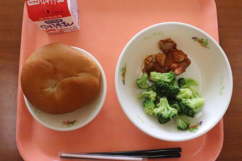 コッペパン、鶏肉のエスニカンシチュー、ブロッコリーサラダ、牛乳
