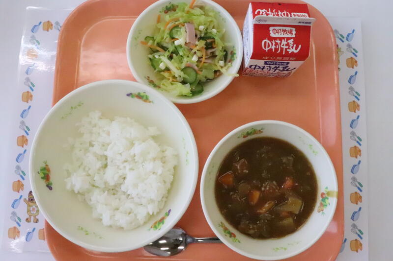 ごはん、じとっこカレー、千切り大根サラダ、牛乳