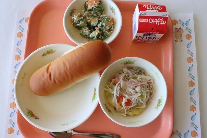 減量マヨネーズパン、コーンラーメン、きゅうりとごぼうのマヨネーズサラダ、牛乳