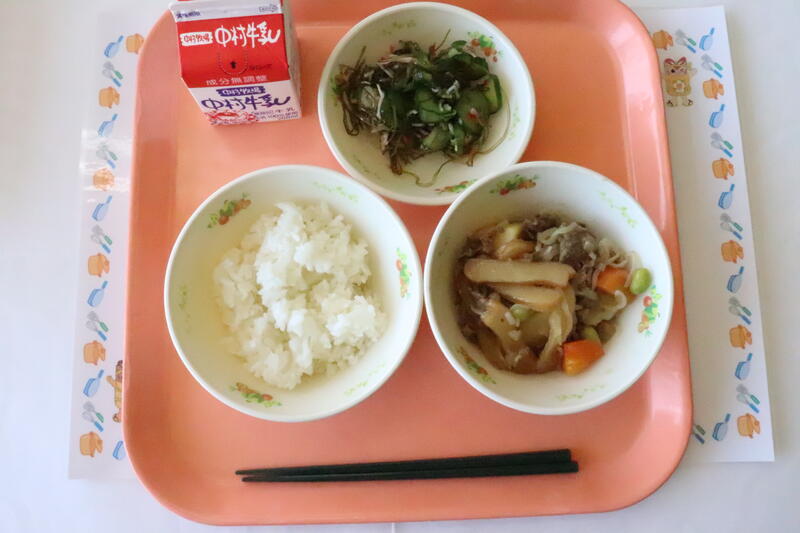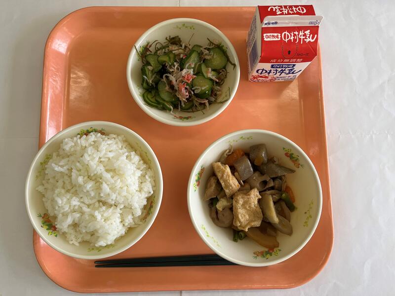 ごはん、肉じゃが、きゅうりの昆布和え、牛乳