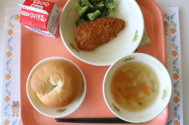 丸ミルクパン、鮭チーズフライ、1食タルタルソース、ブロッコリーサラダ、マロニーのスープ、牛乳