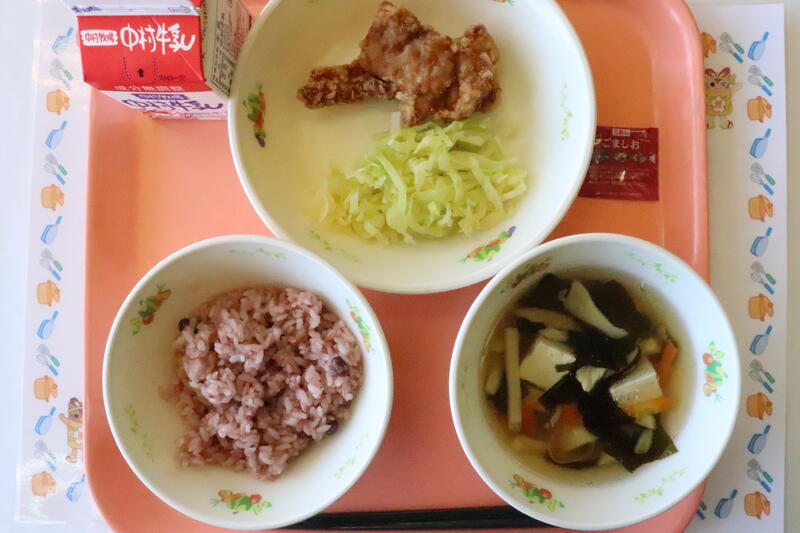 減量赤飯、1食ごま塩、唐揚げ、添えキャベツ、すまし汁、牛乳