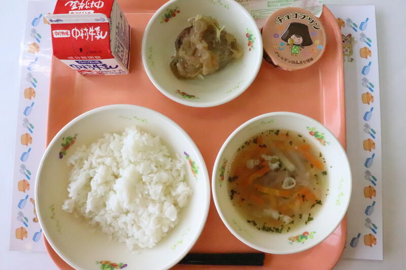 ごはん、黒毛和牛と黒豚のハンバーグ、ポテトスープ、チョコプリン、牛乳