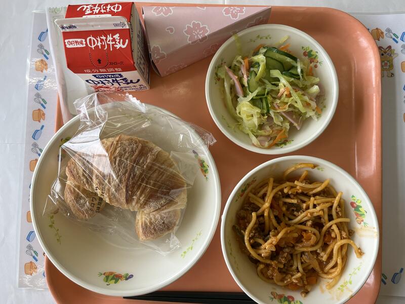クロワッサン、ミートソーススパゲティ、ブロッコリーサラダ、牛乳