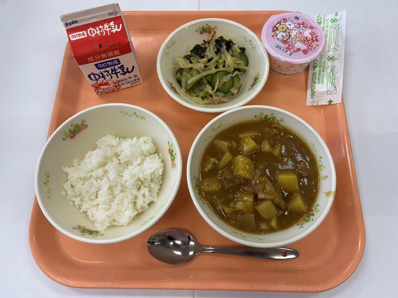 カレーライス 海藻サラダ お祝いゼリー 牛乳