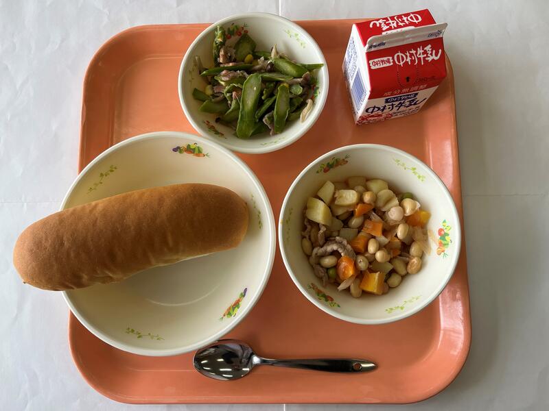 コッペパン ポークビーンズ アスパラソテー 牛乳