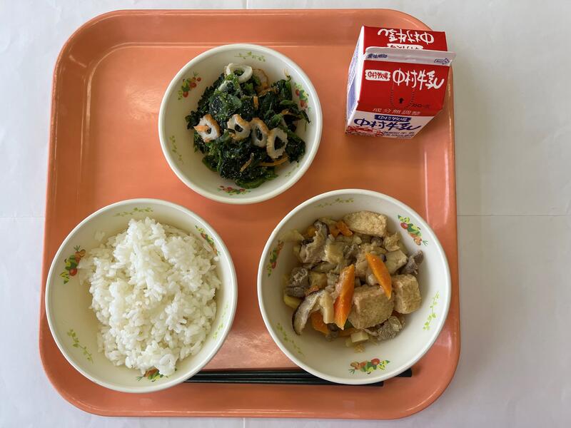 ごはん 豚肉と厚揚げのみそ炒め ほうれん草のごま和え 牛乳