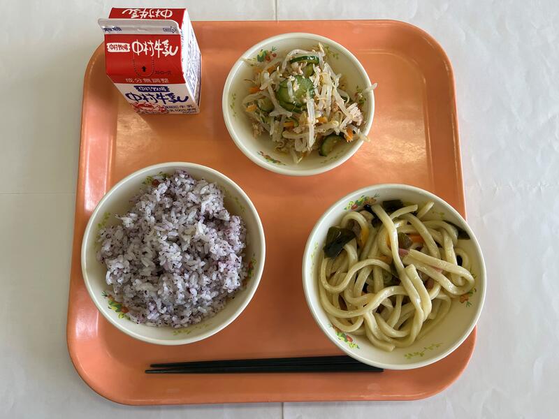 減量梅菜めし、五目うどん、もやしのゴマ酢和え、牛乳