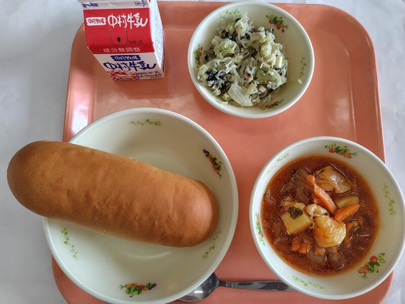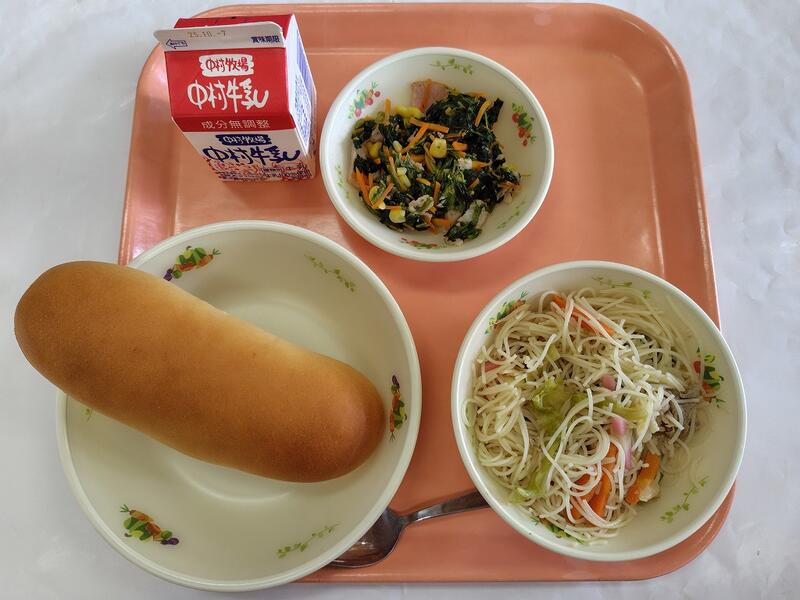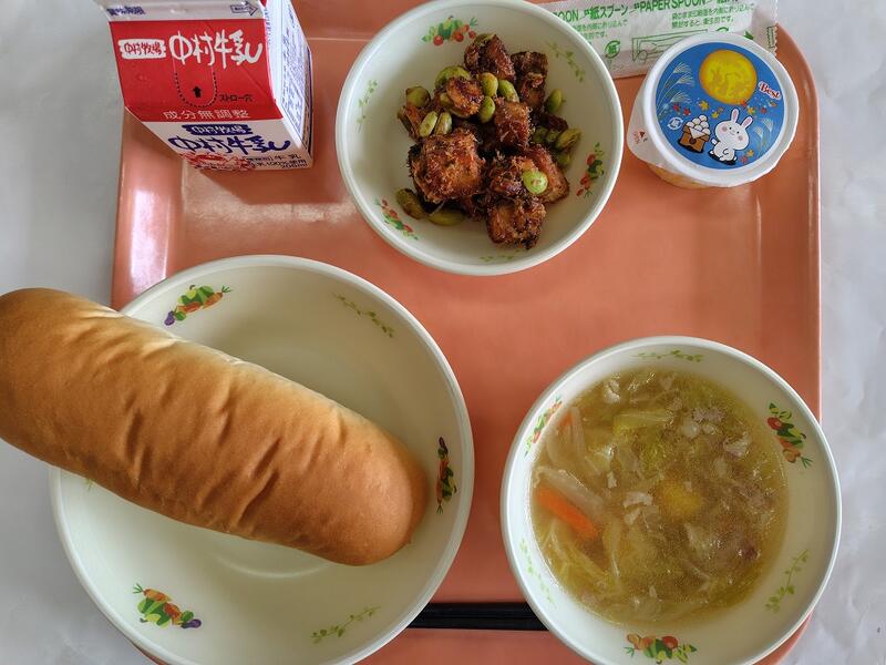 ミルクパン マカロニスープ 大豆と小魚の揚げ煮 牛乳