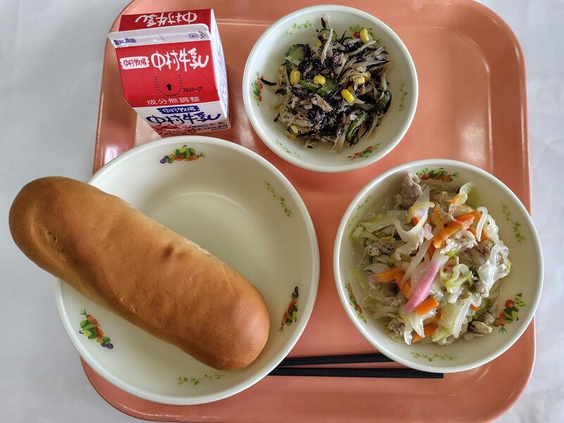 減量黒糖パン ちゃんぽん ひじきとごぼうのサラダ 牛乳