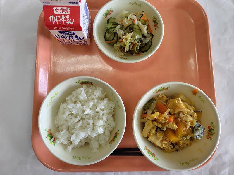 ごはん かぼちゃのそぼろ煮 野菜のこんぶ和え 牛乳