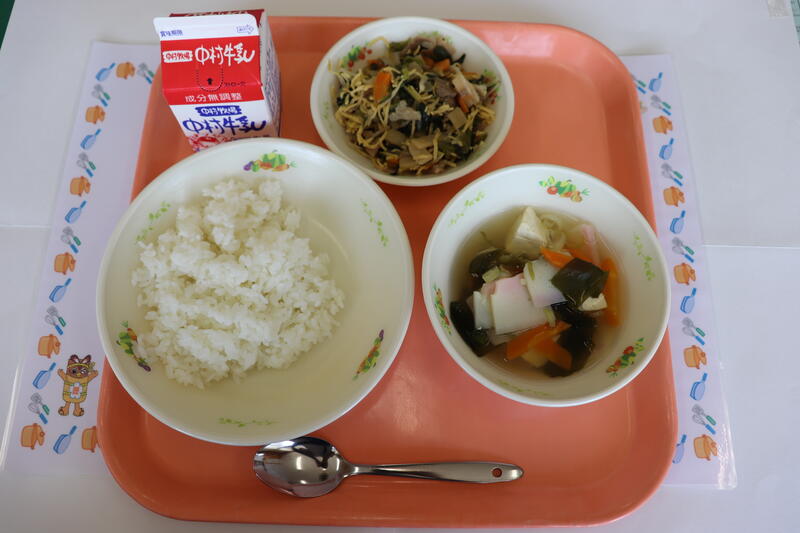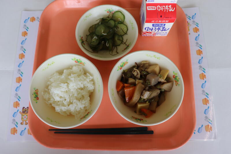ごはん、炒り鶏、きゅうりとちりめんの和え物、牛乳