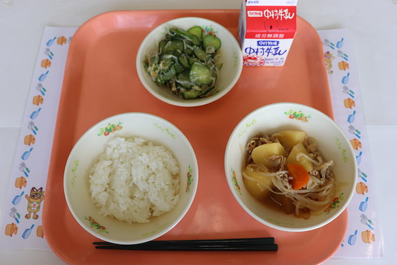 ごはん、肉じゃが、もやしときゅうりの梅肉和え、牛乳
