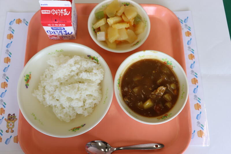 ごはん、ポークカレー、フルーツジュレ、牛乳
