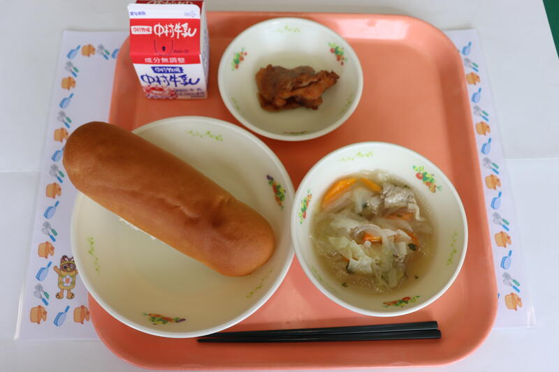 丸コッペパン、鶏肉の豆板醤焼き、添え野菜、ミネストローネ、牛乳