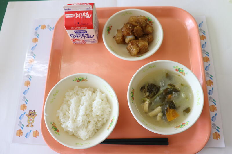 ごはん、魚の香り和え、大根葉の味噌汁、牛乳