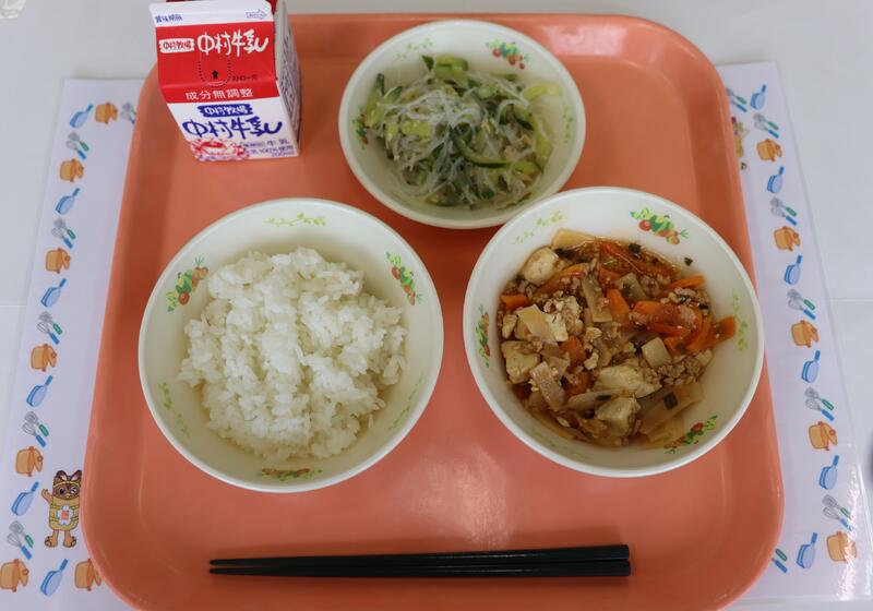 ごはん、かわり麻婆豆腐、バンサンスー、牛乳