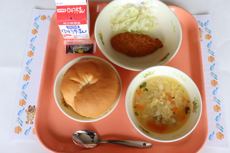 バーガーパン、かつおフライ、一食ソース、添え野菜、チーズのふわふわ卵スープ、牛乳