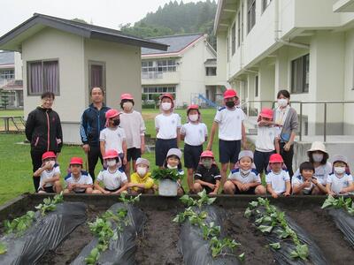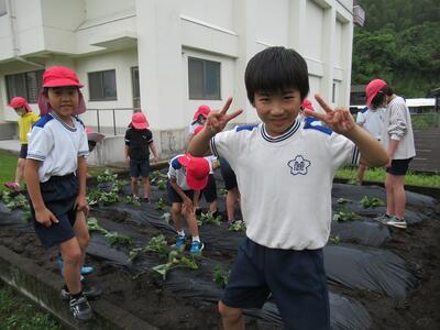 さっそく、全校みんなでサツマイモの苗を丁寧に植えました。収穫した芋を「がね」にしていく予定です。