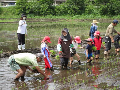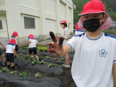6月9日(金)の2~4校時に全校で田植えをしました。今年は、前日の大雨のためか去年より土が軟らかく、子どもたちも泥に足をとられて、植えにくそうでした。しかし、地域支援ボランティアの『ふもとっ子を伸ばす会』の方々や保護者の協力で上手に植えることができました。これから夏に向けて稲は分けつし、生長していきます。水の管理、草刈り、肥料やりなど、ふもとっ子を伸ばす会の方々やPTAの協力をもらいながら、子どもたちと稲の生長を見届けていきたいと思います。