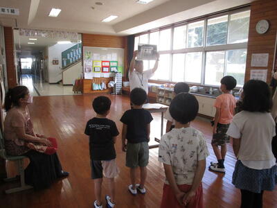また、夏休みにキーボー島(キーボードレッスン)の練習をがんばり、級があがった児童の表彰も行いました。特に段にあがった児童が2名おり、代表で賞状を受け取りました。夏休みという時間がある時にコツコツと努力を重ねた結果で、とてもすばらしいです。