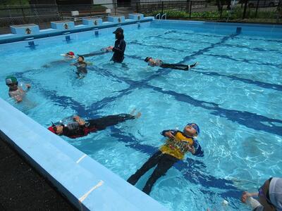 6月11日(火)は、着衣泳を行いました。子どもたちは、いつもと服が違うので、勝手が悪いようでした。体育主任から、まず着衣泳について教室で説明を聞きました。そのあと、実際にプールに行って、服を着たまま「浮く」という体験をしました。合言葉は、「ういて、まて」。子どもたちは、必死に「ういて」助けが来るまでの時間を想定して「まって」いました。自分の命を守るために、良い経験ができました。