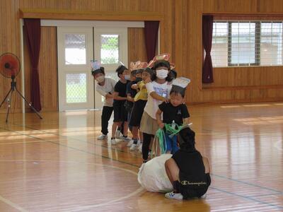 最初に、伝統芸能である俵おどりをみていただきました。次に、海ちゃんの家へのプレゼンづくり(花植え)を行いました。最後に、入所者の方々と子ども達がじゃんけんをし、勝った児童からプレゼントをいただきました。