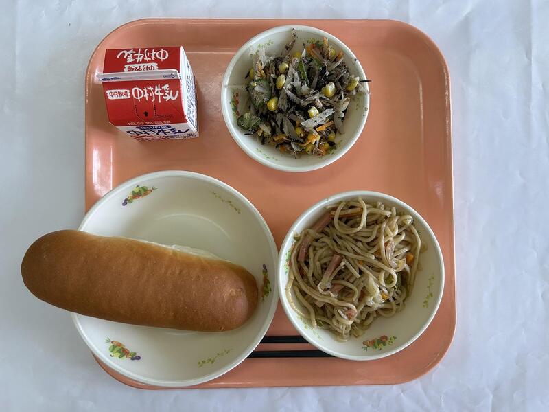 減量ミルクパン 焼きそば ひじきとごぼうのサラダ 牛乳