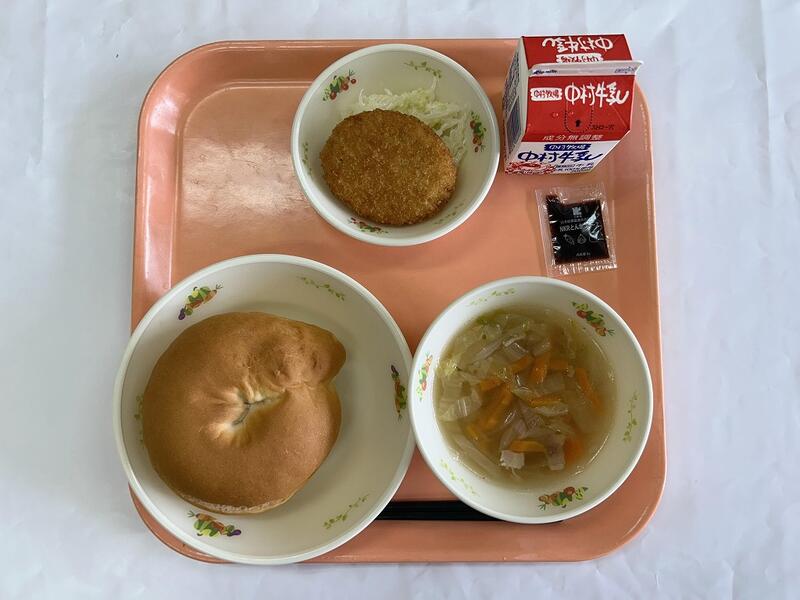 バーガーパン 日向鶏コロッケ キャベツ ソース マロニースープ 牛乳