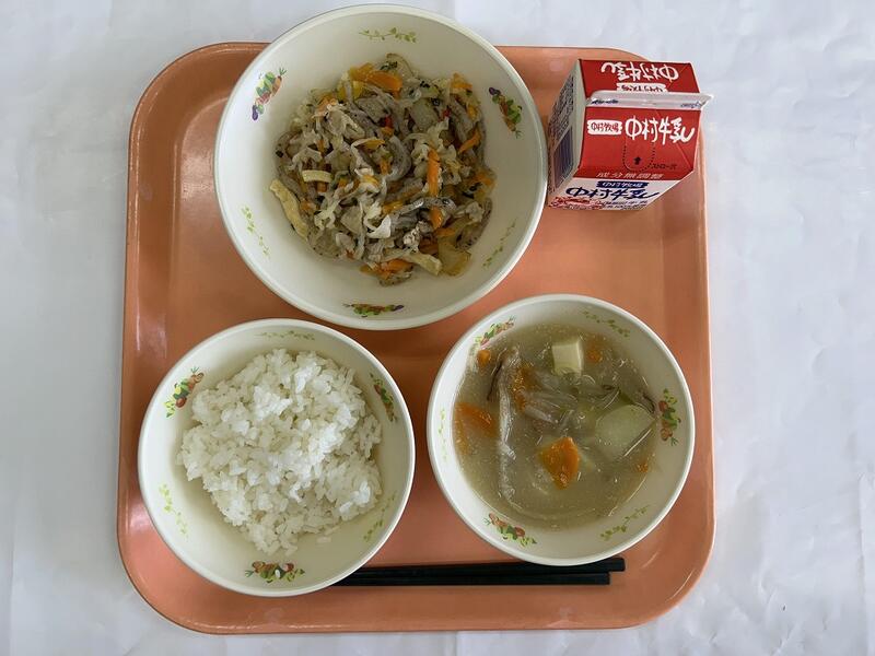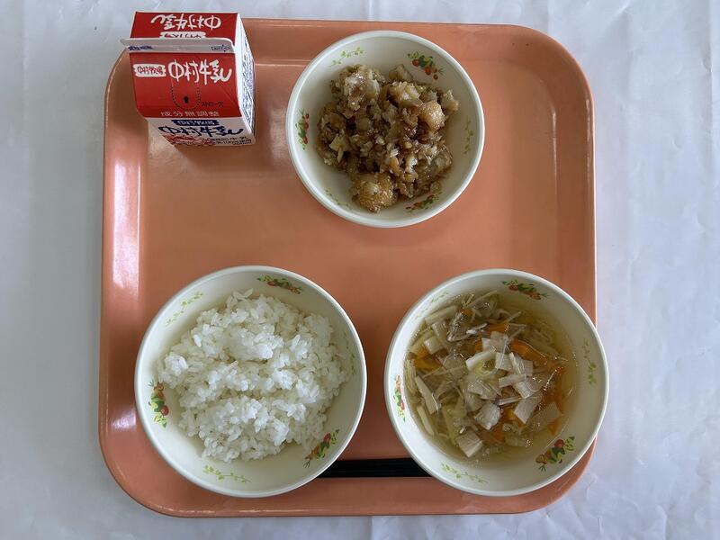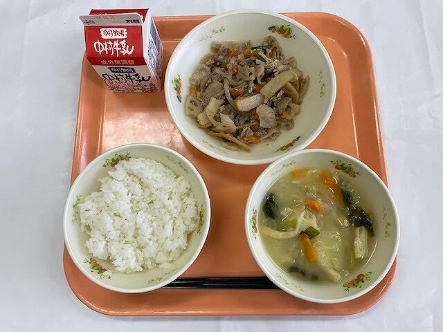 ご飯 蓮根のきんぴら じゃがいもの味噌汁 牛乳