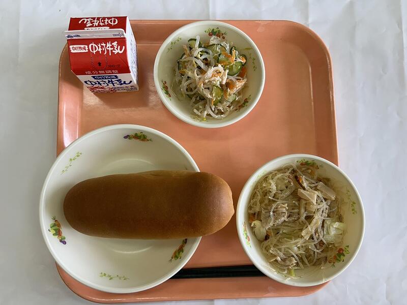 黒糖パン 豚肉と春雨の炒め物 もやしのナムル 牛乳