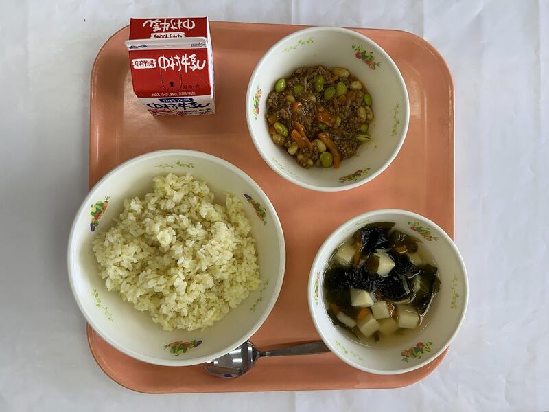 カラフル焼肉丼 豆乳味噌汁 牛乳