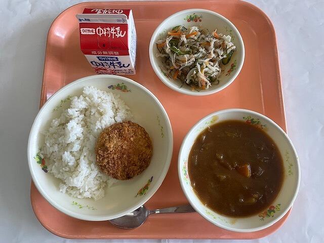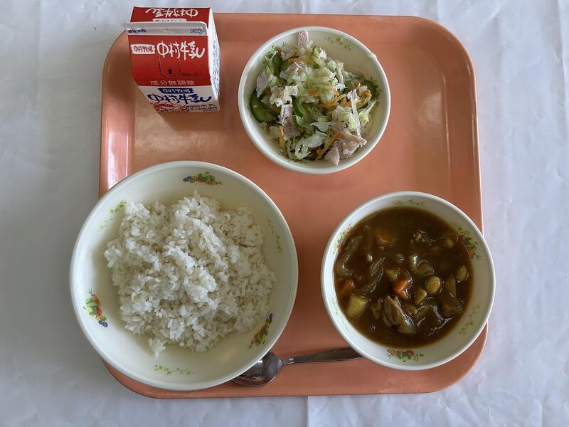 都城メンチゃうまいカレー けん野菜のサラダ 牛乳