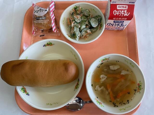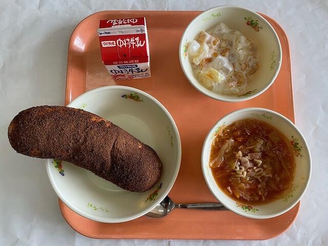 黒糖パン ポテトスープ アスパラのツナサラダ シュークリーム 牛乳
