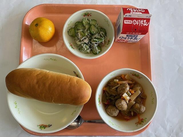 チーズパン ミートボールの甘酢煮 ごま雑魚サラダ みかん 牛乳