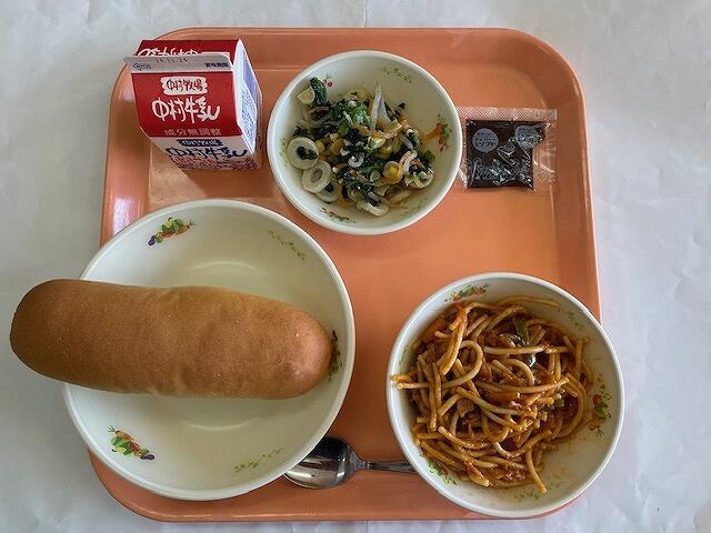 減量ミルクパン ボロネーゼスパゲティ ほうれん草とコーンのレモン和え 牛乳