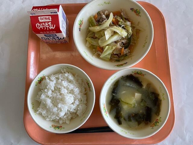 ご飯 豚肉と野菜の生姜炒め なめこの味噌汁 牛乳