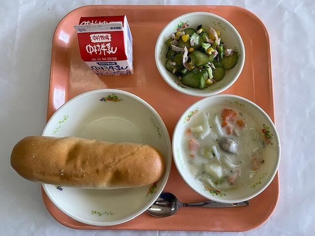 米粉パン 白菜のクリーム煮 ブロッコリーサラダ 牛乳