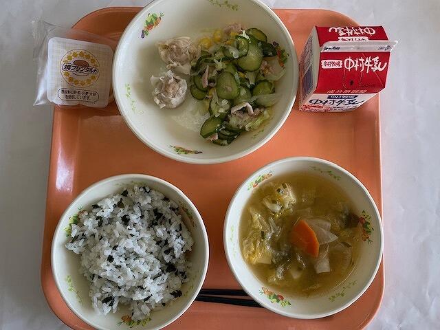 わかめご飯 シューマイ ハムサラダ キムチ汁 プリンタルト 牛乳