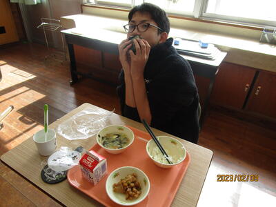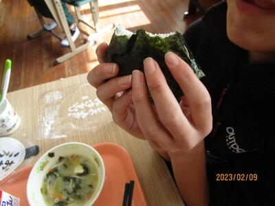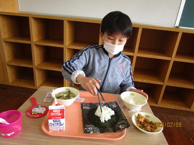 2月9日(木)の給食はおむすび用ののりが出されるということで、3月のお弁当の日に必要な技術を身に付けさせるために、給食の時間におにぎり作りに挑戦しました。低学年の子どもたちは、のりが大きくてごはんを包むのが難しそうでしたが、高学年になると上手にご飯をのりで包んでいました。3月10日の遠足は、お弁当の日になっているので、子どもたちが、どんなお弁当に挑戦するのか楽しみです。