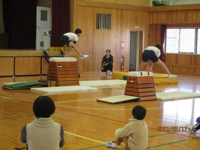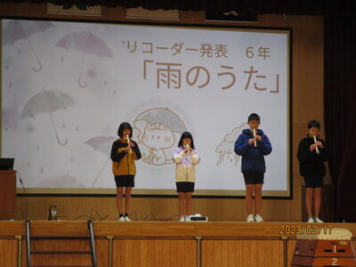 本日(2月17日)の朝の時間に表現集会がありました。本年度最後の表現集会で、5・6年生の発表でした。発表内容は、英語のスピーチ、5年生による国語の発表、6年生によるリコーダー演奏、最後に5・6年生みんなでの跳び箱でした。5・6年生らしい立派な発表で、見に来られていた地域の方や保護者の皆さんも感動されていました。この5・6年間で大きく成長した姿を在校生をはじめ、地域や保護者の皆さんに見ていただけてよかったです。