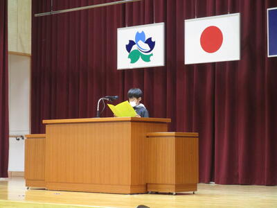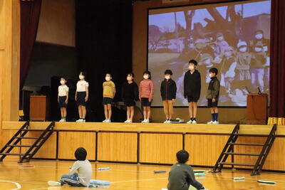 12月23日(金)は2学期の終業式でした。最初に、3年の日愛さんと6年の美結さんが2学期頑張ったことについて発表しました。2学期は行事が多く忙しい毎日でしたが、そんな中でも勉強や行事を通して頑張ったと感じることができた学期だったようです。また、2学期の多読賞の表彰もありました。進んで読書をする児童たちが、たくさんおり、みんなのお手本になっていました。