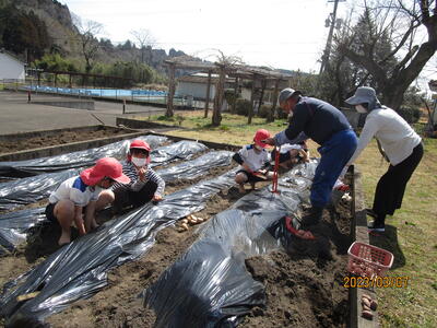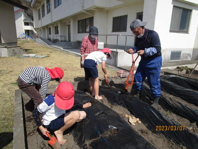 3月7日(火)に、2年生は、ふもとっ子を伸ばす会の方々と一緒にジャガイモの種植えをしました。事前に土作りやマルチ張りなど、ふもとっ子を伸ばす会の方がしてくださり、とても助かりました。子どもたちは、半分に切られた種芋を穴の中に入れ、土をかぶせる活動をしました。種芋を穴に入れるときは、「切り口を下にして植えるといいよ。」とアドバイスをいただきながら作業を進めました。収穫がとても楽しみです。