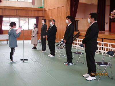 3月30日(木)離任式がありました。今年度は5名の先生方が高崎麓小学校を去られます。離任者紹介の後、お一人ずつ挨拶をいただきました。次に、代表児童によるお礼の言葉がありました。最後は、みんなで1列になり、先生方を送り出しました。先生方の新たな学校での活躍を願っています。