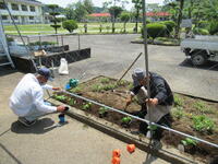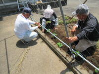 今日も気温が上がり、少しずつ夏に向かっているのが気温の変化でわかる時期になりました。少しでも室内温度を下げるために、今年度も事務室前から、職員室にかけてゴーヤのグリーンカーテンを設置することになりました。設置にあたって、ふもとっ子を伸ばす会の方々にお手伝いいただきました。ありがとうございました。