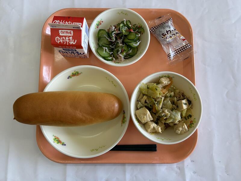 チーズパン ホイコーロー 胡瓜の中華和え チョコ大福 牛乳