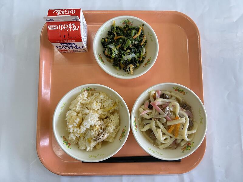 キムタクご飯 肉うどん ほうれん草の胡麻和え 牛乳