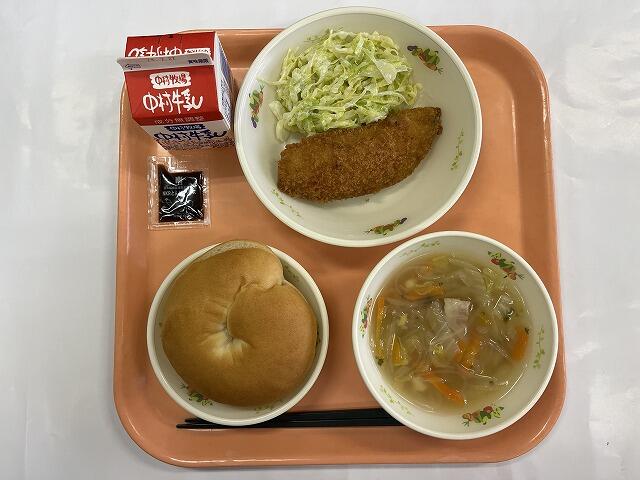 バーガーパン 鮭チーズフライ 添えキャベツ マロニースープ 1食ソース 牛乳