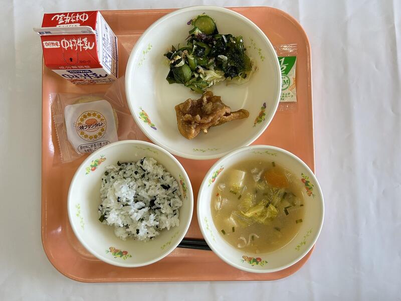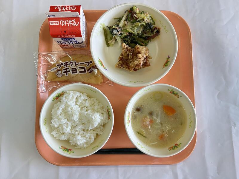 ご飯 なめこの味噌汁 唐揚げ 海藻サラダ クレープ 牛乳