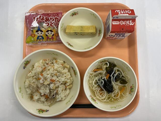 五目ずし ちぐさ焼き 魚そうめん汁 ひなあられ 牛乳